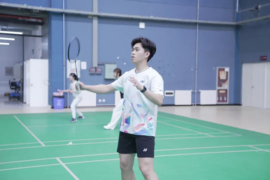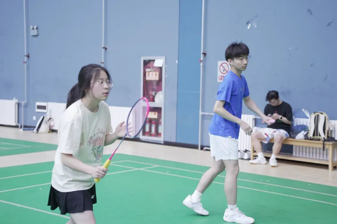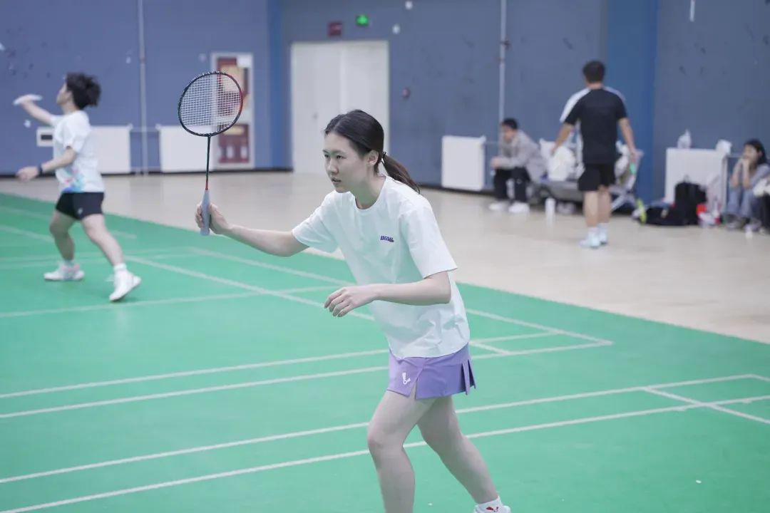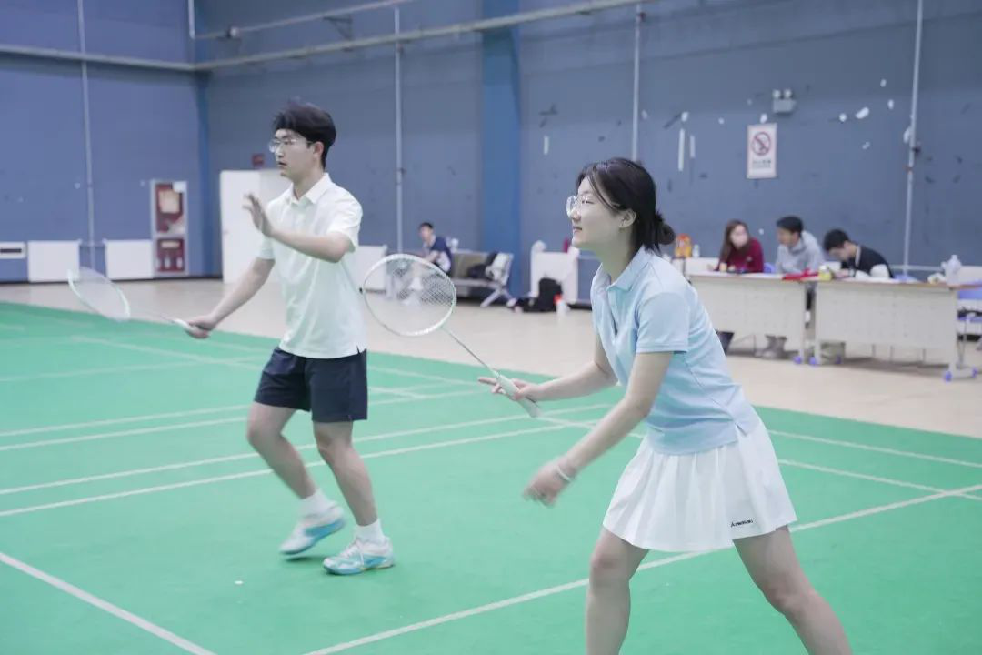 晨光初绽,羽毛球馆内已涌动起蓬勃朝气。四个学院的选手们早已就位。鞋胶与地板的摩擦声、球拍击球的脆响、电子计分器的滴答声,共同谱写出初夏清晨最激昂的序曲。